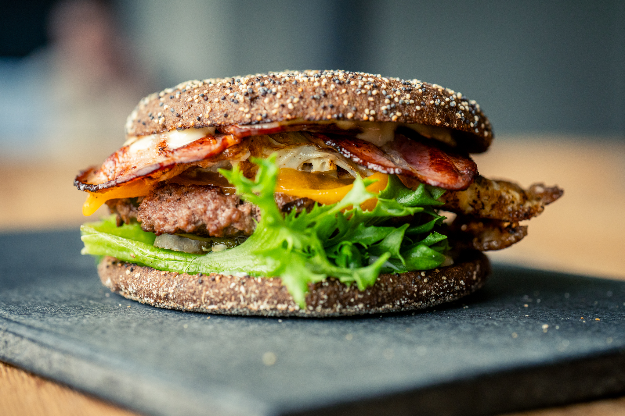 2x Naudanliha-pihvi pekonilla, Cheddar, Terva-BBQ Majo, Kananmuna, Pikkelöity punasipuli, Suolakurkku, Salaatti
