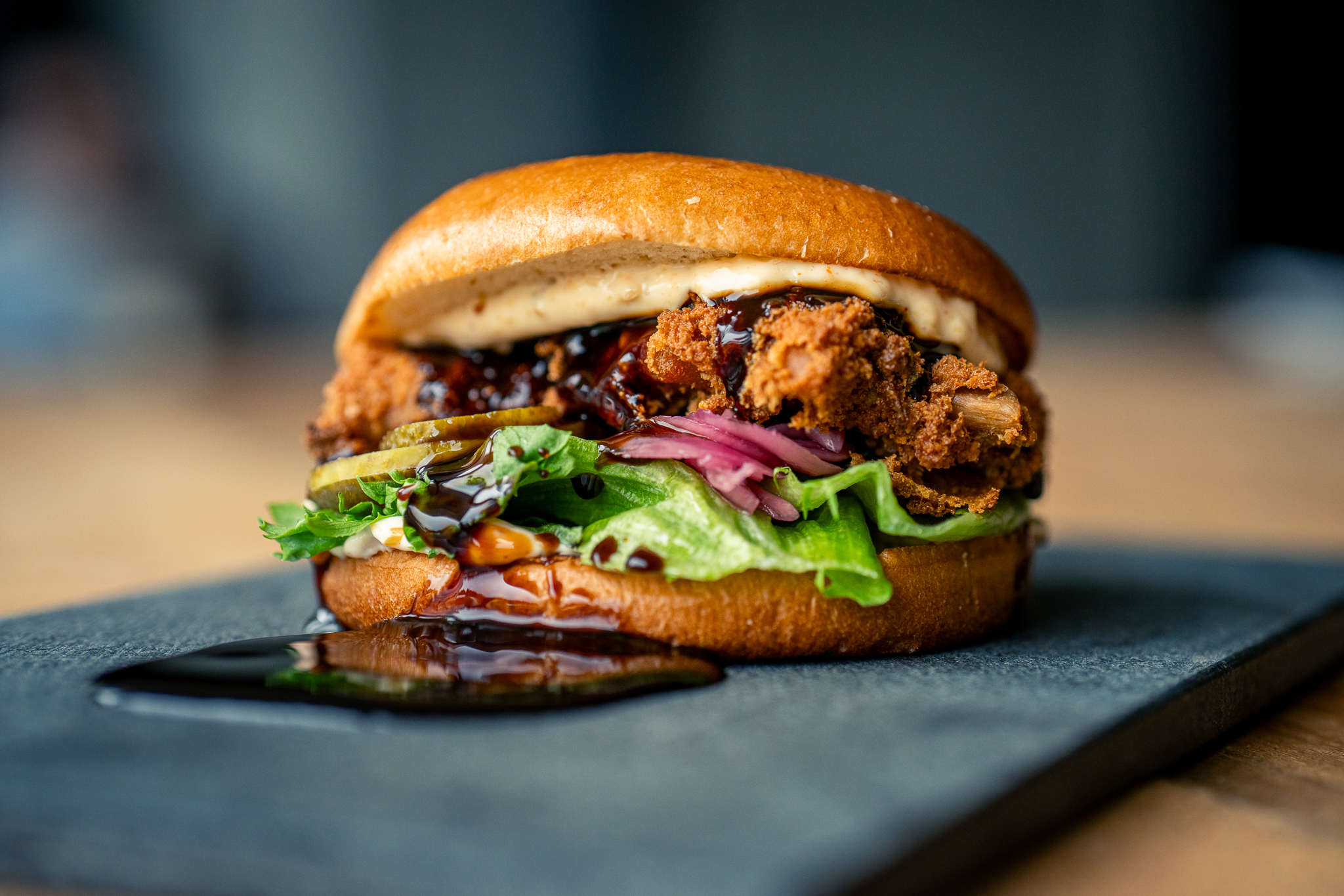 Paneroitu kananfilee, Kimchimajo, Teriyaki-kastike, Pikkelöity punasipuli, Suolakurkku, Salaatti